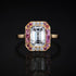 An emerald cut diamond ring with pink diamond and sapphire detail, mounted in french gold.