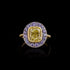 A 4ct cushion cut fancy intense yellow diamond mounted in 18k yellow gold with a lilac sapphire pavé mix of stones for the surround, the sapphires were sourced specially from Sri Lanka.