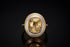 An oval cut unheated yellow sapphire ring, surrounded in haloes of platinum and 18k yellow gold, perfectly framed, to emphasize the colour of the gem.